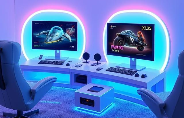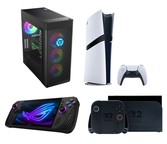 Za potrebe poročanja in testiranja iger uporabljamo različne računalnike in konzole. V ospredju sta namizni računalnik Lenovo Legion T7 in Sonyjeva konzola PlayStation 5 Pro, sledita pa še handheld računalnik Asus ROG Ally X in konzola Nintendo Switch 2.